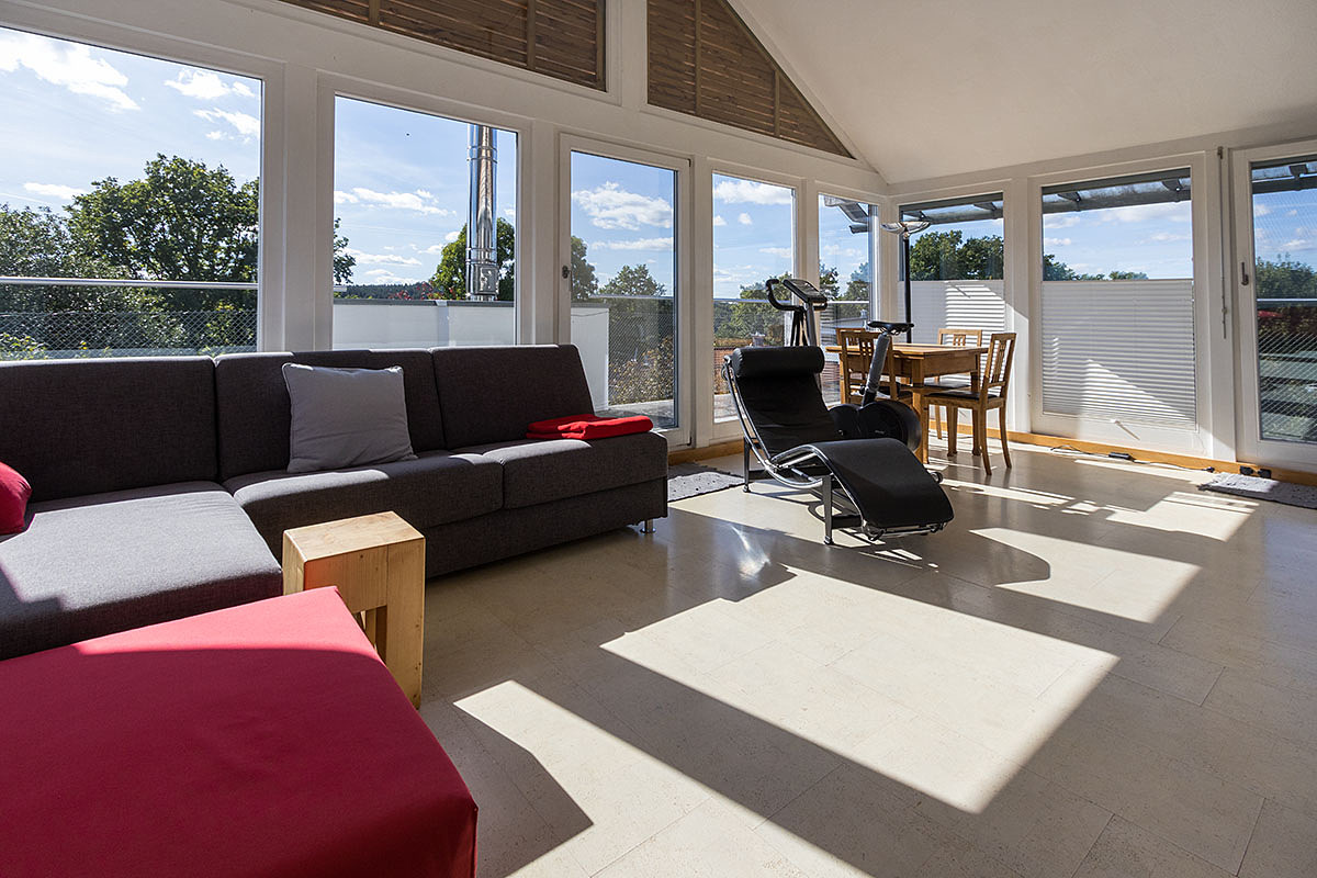 Mit sicherem Sinn für Wirkung und Weite begegnet Ihnen hier Raum und Licht in konzentrierter Form und arrangieren zusammen mit den großen Fensterformaten das spannende Raumgefüge. Garanten für Ihr tägliches Wohlfühlen sind der riesige Wohn- und Essbereich mit gemütlichem Kaminofen, Küche mit angrenzendem Hauswirtschaftsraum, hübsche Fliesen- und Naturkautschukböden sowie die zahlreichen Gartenzugänge rund ums Haus. Die sep. Einliegerwohnung im DG bietet zusätzlich Platz für Büro oder Gäste und von der Dachterrasse genießen Sie einen herrlichen Blick in die weite Natur und Landschaft.