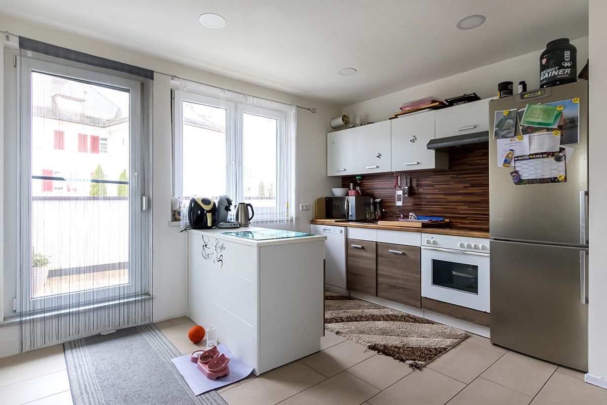Trendige Wohnküche mit direktem Zugang auf den eigenen Balkon.