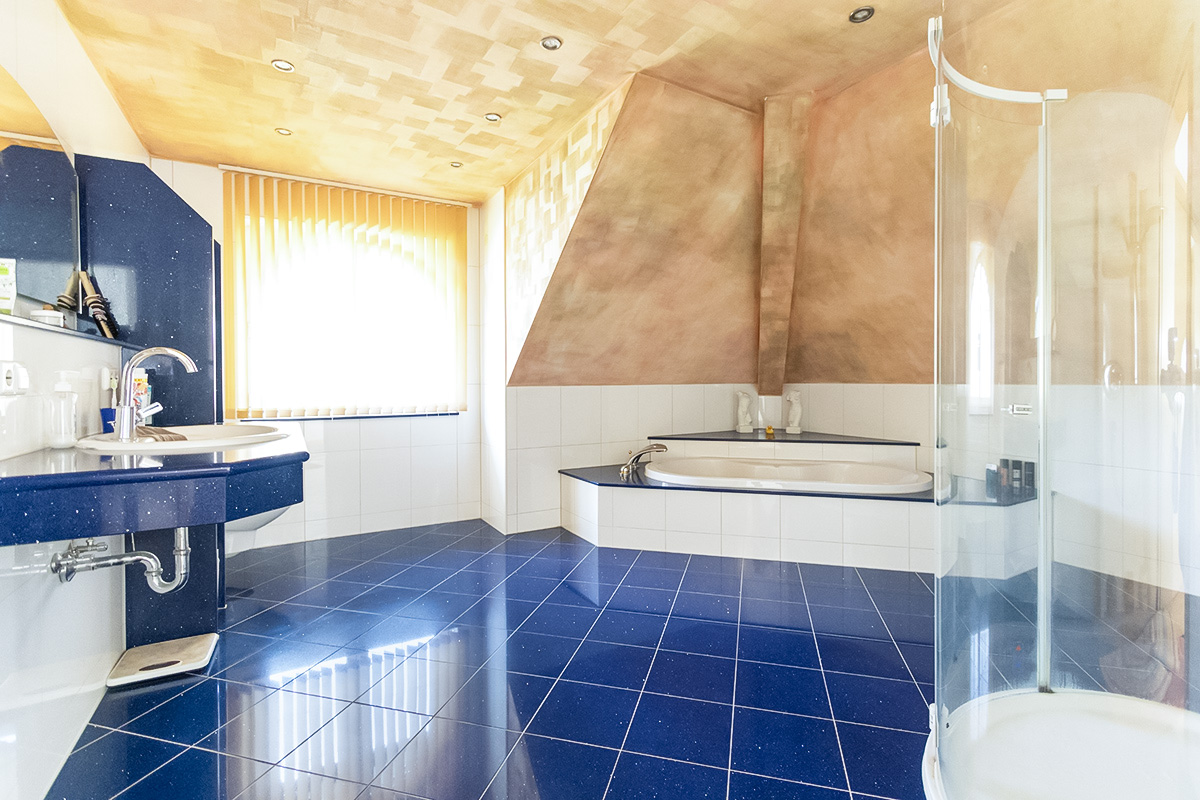 In exklusiver Lage, direkt am grünen Ortsrand mit einem atemberaubenden Blick auf die umliegende Natur, erwartet Sie dieses Domizil. Auf großzügigen ca. 200 m² Wohnfläche bietet es viel Raum zum Leben und Wohlfühlen. Die hochwertige Ausstattung und das durchdachte Design schaffen eine einzigartige Wohnatmosphäre, die höchsten Ansprüchen gerecht wird. Der weitläufige Wohn- und Essbereich, mit beeindruckenden 56 m², bildet das Herzstück des Hauses. Extravagante Fliesenböden und Rundbogenfenster, die moderne Küche, ausgestattet mit einer hochwertigen Einbauküche und praktischer Speisekammer, der gemütliche Kachelofen und nicht zuletzt das Gästebad lassen keine Wünsche offen. Ein absolutes Highlight ist das riesige Wohnbad im DG, es bietet Ihnen täglich ein Spa-Erlebnis. Für den Alltag besonders praktisch ist die geräumige Doppelgarage mit direktem Zugang ins Haus und im UG punktet die großzügige Nutzfläche, die ganz nach Ihren Wünschen gestaltet werden kann, ob als Büro, Hobbyraum, Ausstellungsfläche oder sogar als separate Einliegerwohnung.