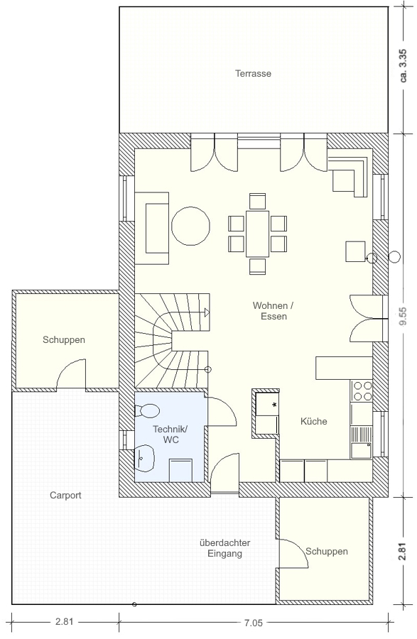 - ca. 110 m² Wohnfläche, 4,5 Zimmer, Küche mit Einbauküche, Bad, 2 WC