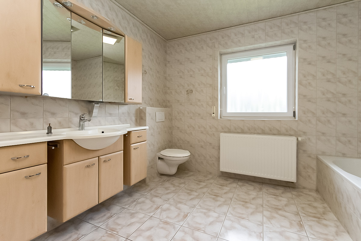 Das Bad ist praktisch gestaltet und sorgt für stressfreie Abläufe im Familienalltag.