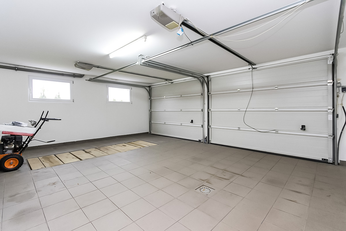 Die Doppelgarage mit Sektionaltoren ermöglicht trockenen Zugang ins Haus.