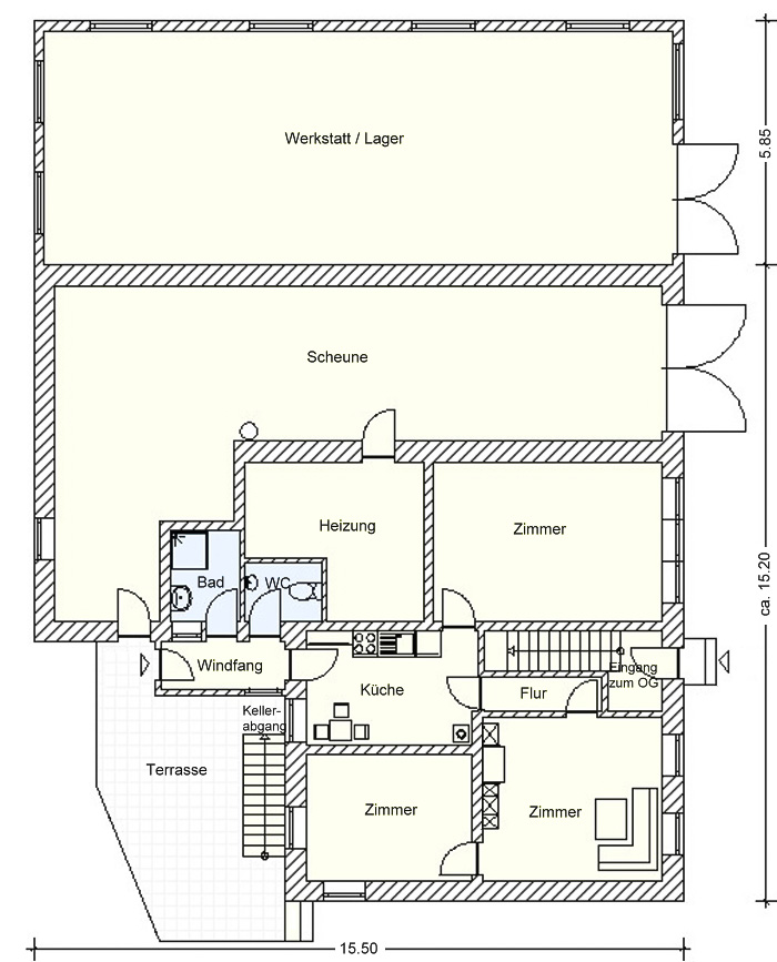 Dieses liebevoll modernisierte, ehemalige Bauernhaus, wurde 2016 umfassend saniert und verbindet heute historischen Charme mit modernem Wohnkomfort. Im Erdgeschoss und im Obergeschoss stehen jeweils eigenständige, großzügige Wohnungen zur Verfügung. Bei Bedarf lässt sich zudem das Dachgeschoss ausbauen und eröffnet damit weiteres Potenzial für individuelle Wohnträume. Hochwertige 3fach- Verglasungen und eine moderne Heiztechnik sorgen zu jeder Jahreszeit für ein angenehmes Raumklima sowie niedrige Betriebskosten. Die große Scheune und die angrenzende Halle bzw. Werkstatt bieten umfangreiche Abstell- und Arbeitsflächen für Fahrzeuge aller Art. Auch für einen kleinen Handwerksbetrieb oder für passionierte Autobastler finden sich hier ideale Voraussetzungen. Der geschützte Garten hinter dem Haus bietet Kindern und auch Ihrem vierbeiniger Freund sicheren Freiraum und Hobbygärtnern ausreichend Platz zur Entfaltung.