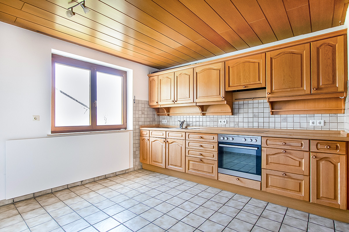 Zeitlose Einbauküche in behaglicher Holzoptik praktisch durchdacht und bestens erhalten.